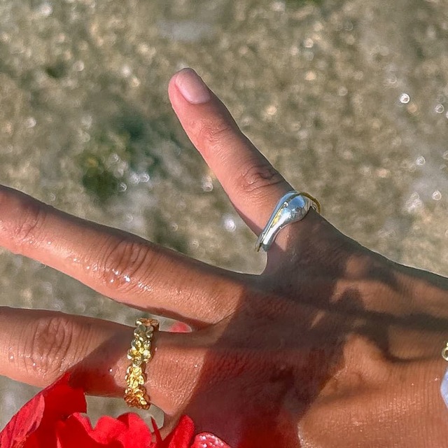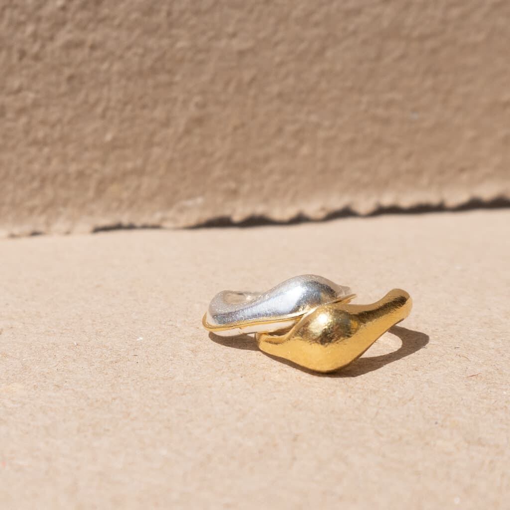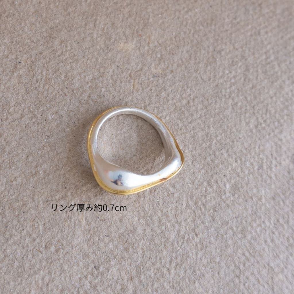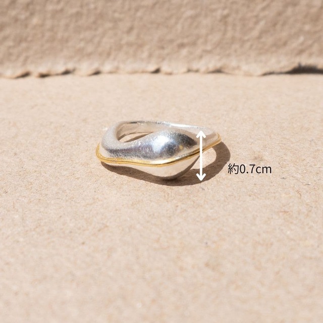 海を見つめた時に見える、波の形から着想を得たアブストラクトな地金リングです。波間に光る太陽のように、シルバーベースにゴールドの繊細なラインが個性的に輝きます。